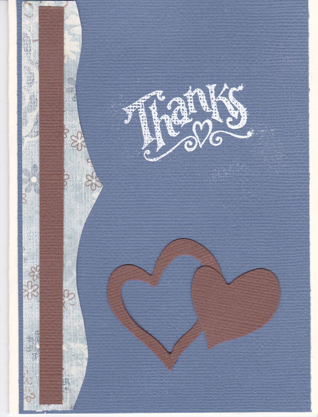 Basic cards - using scraps of paper from other projects...do you know how many cards I have made and given away that was made just from scraps of paper...too many to count, but this is one of them. I was working on another project at the time, and kept the scraps from the framed page. The colors in the blue patterned paper has a bit of brown in it, so that color was used for the accent color. I used my Sizzix heart die cut - which is used for many other projects as well - for the only accent, with a simple "Thanks" saying was used, but you could use whatever you have available to you instead!